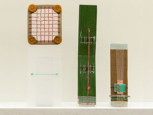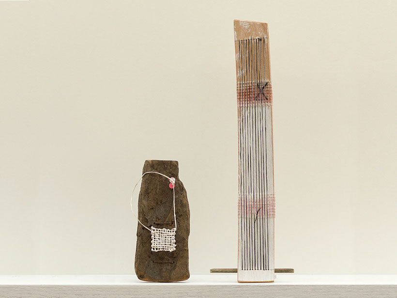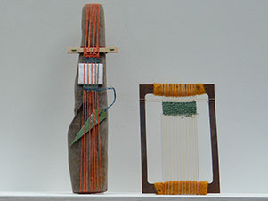 Warp cotton, wool weft, paper, driftwood, metal gasket