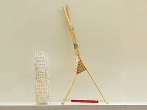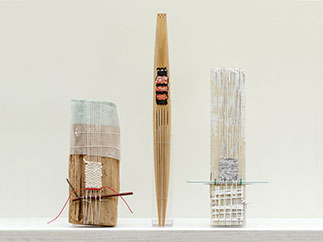 Woven linen, gesso, bound sticks, tapestry weaving, sinew