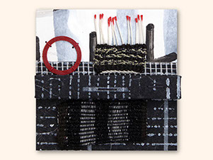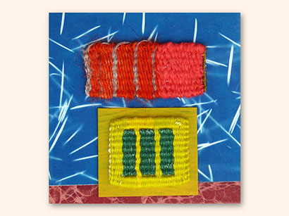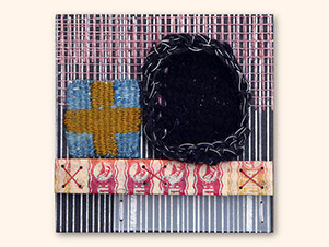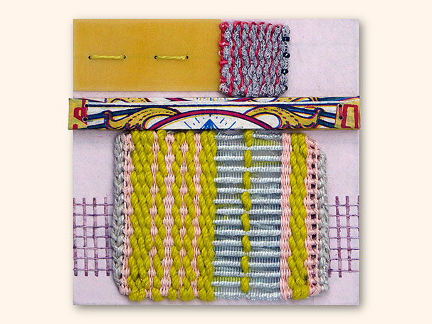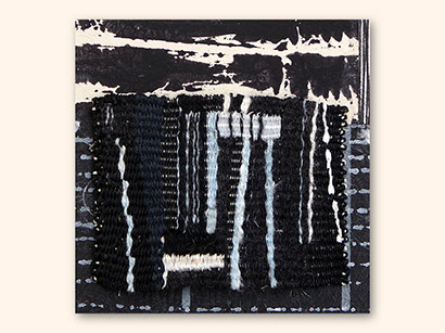 Cotton warp, linen, wool, acrylic weft, wood, washer, paper, paint